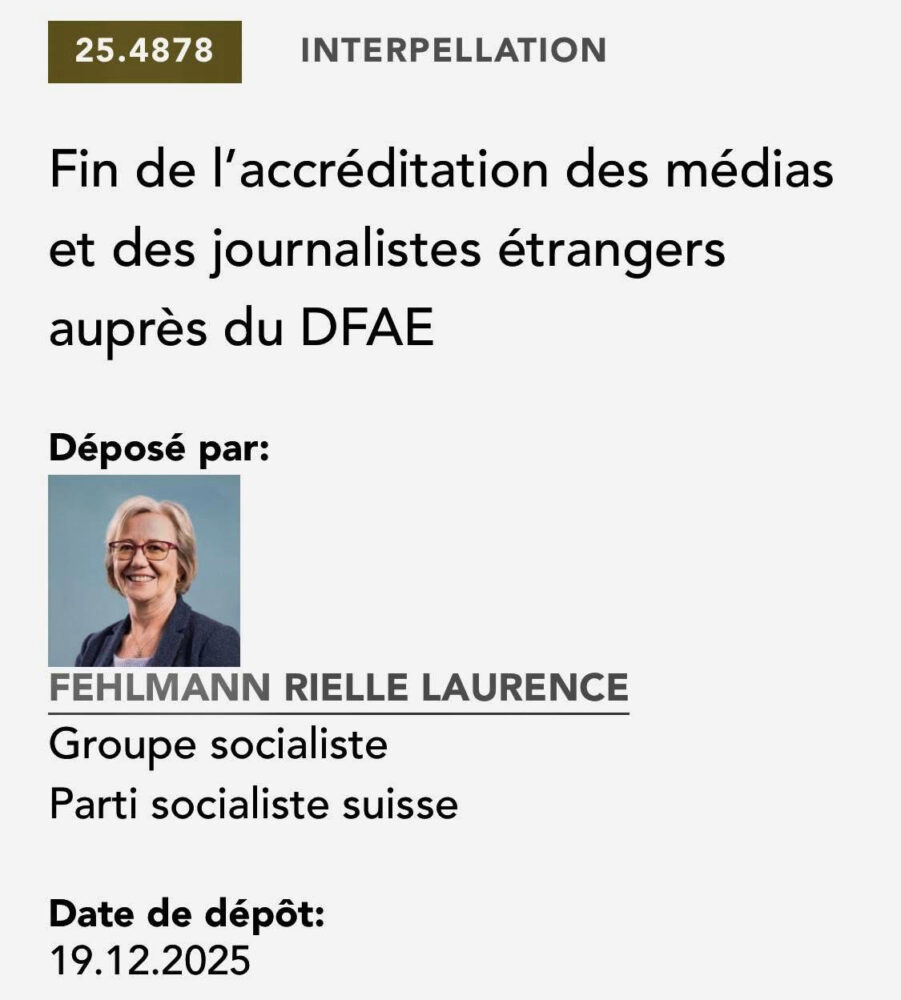 Le Département Fédéral des Affaires Étrangères (DFAE) supprime fin 2025 l’accréditation des journalistes de la presse étrangère en Suisse et le règlement les protégeant depuis 1992. Sans même consulter les intéressés.