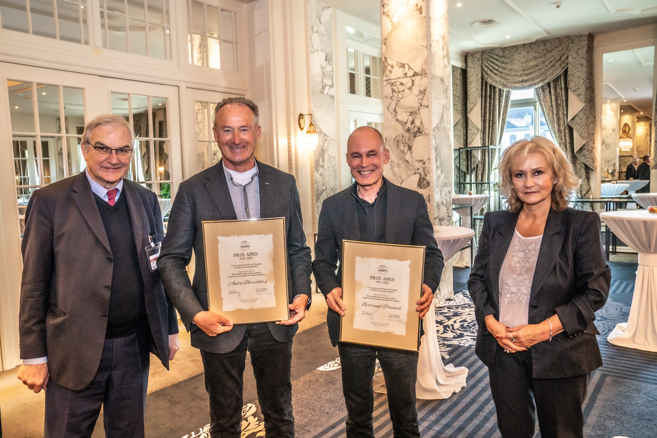 Les pionniers de Solar Impulse, le psychiatre et explorateur Bertrand Piccard, actuel président de la Fondation du même nom, et le pilote, aujourd’hui PDG de H55, André Borschberg, ont reçu le Prix APES 2019-2020 pour leur exploit autour du monde en avion propulsé exclusivement par l’énergie solaire. La cérémonie officielle de remise du Prix s’est tenue à l’issue du Déjeuner Présidentiel APES à Berne, le 18 octobre 2024, à l’Hôtel Schweizerhof, en présence de la Présidente de la Confédération, Mme Viola Amherd.